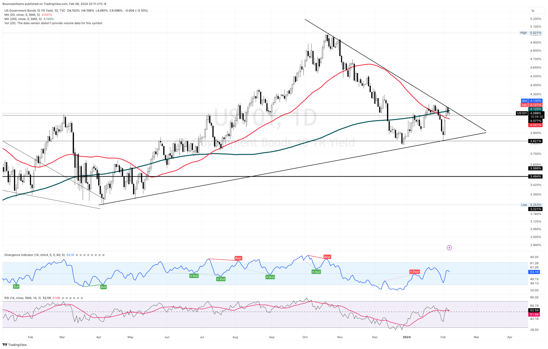 The chart you're seeing displays the daily price movement of the 10-year treasury yield over the past year. It highlights the 50-day moving average (50-DMA) in red and the 200-day moving average in green (200-DMA). In stock trading, a bullish pattern known as the golden cross occurs when the 50-DMA crosses above the 200-DMA. However, what we're observing here is the opposite - the 50-DMA crossing below the 200-DMA, known as the Death Cross. Additionally, prices have consistently closed below the 200-DMA for the majority of the past two months. The pennant/wedge formation surrounding the prices indicates trend lines serving as resistance and support. Currently, prices are hovering just below the 200-DMA and the downward-sloping trend line which is bearish. However, it’s too early to predict price movements definitively, since there is some positive momentum with prices holding above the shorter-term 50-DMA, and the weekly chart is showing more positive signs. Also, we are at a pivotal point where prices could break above both the 200-DMA and the boundary line of the Pennant/Wedge formation which would be bullish for higher yields if prices can hold above those key levels. However, If prices retreat and break below the lower trend line, there's potential for yields to retreat to around 3.49%, which could be favorable for mortgage rates and, subsequently, the mood of the real estate market.